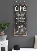 Metalowy zegar ścienny, dekoracyjne napisy, wieszak.