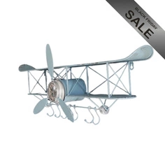 Metalowy zegar ścienny, dwupłatowiec, półka, wieszak.