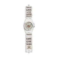 Metalowy zegar ścienny, dekoracyjne napisy, wieszak.