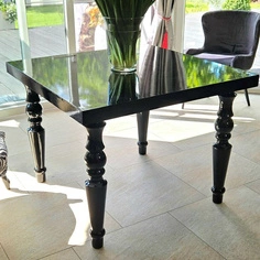 Czarny stół, toczone nogi, wysoki połysk.