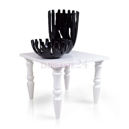 Gładki blat opiera się na stabilnych, toczonych nogach. Mebel wygląda interesująco, a na uwagę zasługuje kontrast pomiędzy krawędziami stołu a obłymi, przyjemnymi dla użytkowników kształtami toczonych elementów. Powierzchnia lakierowana na wysoki połysk odbija światło, tworząc charakterystyczne refleksy na obłych powierzchniach i dodając luksusowe wrażenie. Stolik wykonany z litego drewna i płyty MDF.