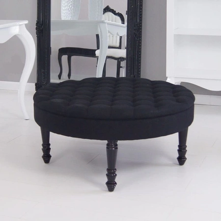 Stylowa, tapicerowana, okrągła pufa-taboret, toczone nogi, czarna.