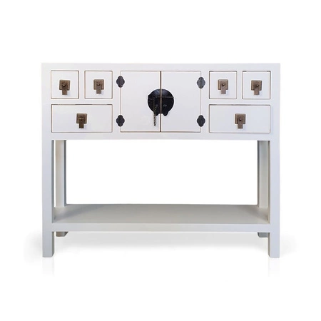 Konsola w stylu azjatyckim, szuflady, półka, metalowe okucia, biały mat.