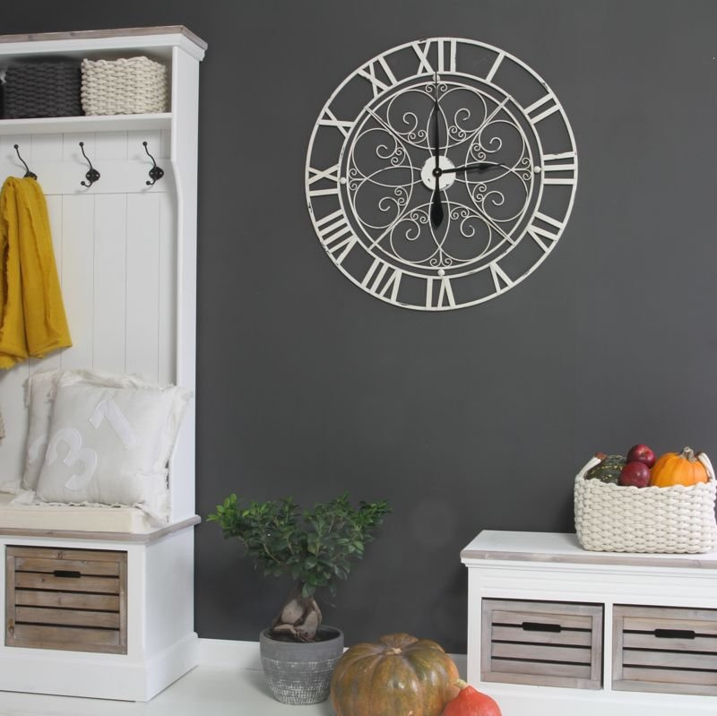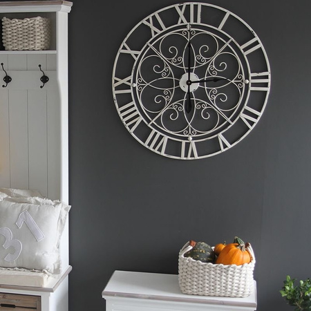 Otaczają okrąg z unikatową dekoracja. Są to subtelne, cieniutkie woluty, które zostały interesująco zakomponowane w okrągłej przestrzeni. Przeplatające się spore zawijasy zostały wzbogacone o znacznie mniejsze, które otaczają przestrzeń z zamocowanymi wskazówkami. Czarne wskazówki są mocnym akcentem na tle białego cyferblatu.