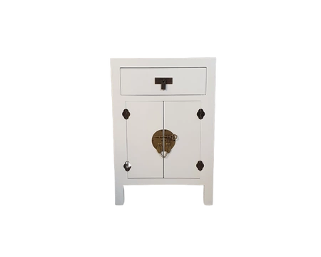 Komoda, metalowe okucia, matowa biel, styl azjatycki.