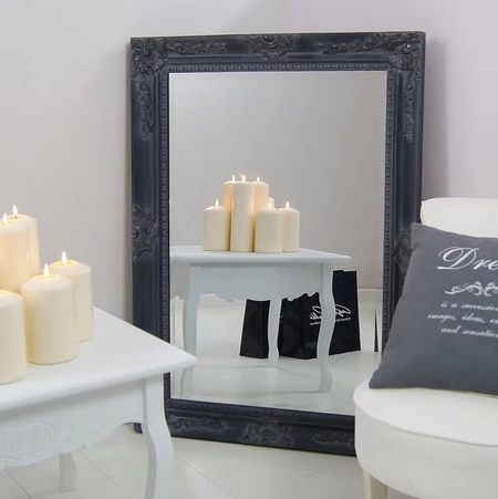 Lustro w drewnianej, grafitowej ramie z przecierką w kolorze bieli. Zdobią je piękne ornamenty. Można zawiesić pionowo lub poziomo.