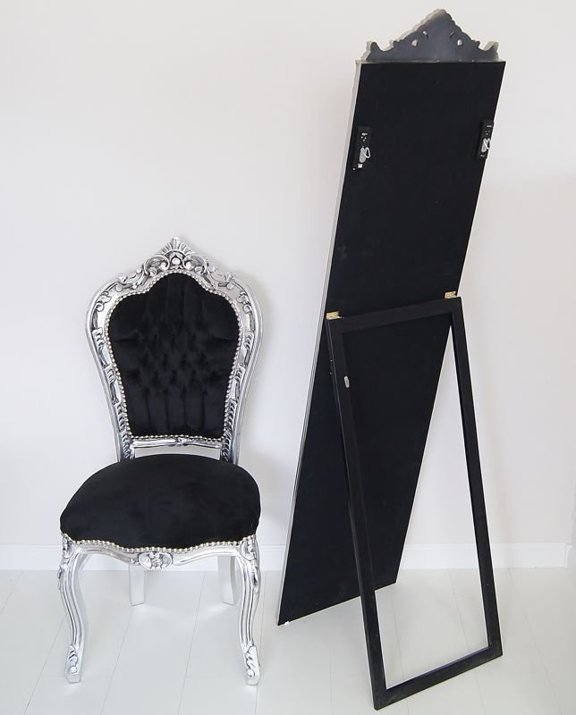 Smukłe, niezwykle eleganckie srebrne lustro stojące z możliwością zawieszenia na ścianie.