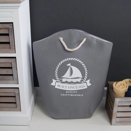 Płócienny, szary materiał koresponduje z białym nadrukiem żaglówki oraz rączkami plecionymi ze sznurka. Jednoznacznie kojarzy się ze spacerem po molo, gorącym od słońca piaskiem i zapachem morza.