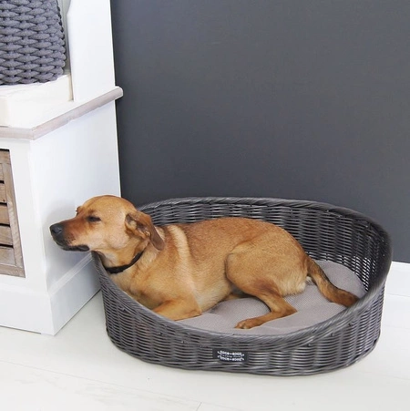 Kosz został wykonany z technorattanu, co umożliwia wygodne czyszczenie. Piękny kolor w odcieniach szarości i dopasowana kolorystycznie poduszka powodują, że kosz pasuje prawie do każdego wnętrza i jest dość odporny na zabrudzenia. To bardzo praktyczne, a zarazem estetyczne legowisko.