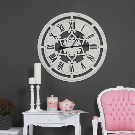 Cyferblat jest wycięty z drewna, co tworzy ciekawy ażurowy efekt. Środkowa i najbardziej ozdobna część zegara to symetryczna, wycięta dekoracja z zawijasów, która nadaje mu delikatny, romantyczny charakter. Z bielą cyferblatu kontrastują czarne cyfry rzymskie godzin oraz śliczne, smukłe wskazówki. Mechanizm zegara na baterię 1,5V.