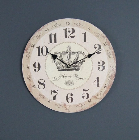 Wewnętrzny krąg, pomalowany na biało, jest najbardziej ozdobną częścią zegara. Na środku znajduje się wspaniały rysunek bogato zdobionej korony, a poniżej napis dekoracyjną czcionką, oznaczający przynależność zegara „La Maison Royale” (Dom Królewski) wraz z datą w ozdobnym kartuszu. Wskazówki zostały wykonane z metalu i pomalowane na czarno, co pasuje do graficznego stylu dekoracji. Cała powierzchnia zegara została postarzona. Zegar w stylu vintage z bardzo czytelną tarczą, mechanizm na baterię 1,5V.