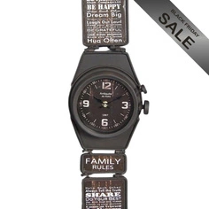 Na ciemnobrązowych polach przypominających drewno zostały umieszczone słowa, kojarzące się zasadami, które powinny kierować kochającą się rodziną i wpływać na wzajemne więzi. Napisy mają biały kolor i zostały sporządzone kilkoma krojami czcionek o rożnych rozmiarach. Pełnią funkcję dekoracyjną, wpływają na urozmaicenie prostych powierzchni i nadają głębszego znaczenie wspólnym przestrzeniom, gdzie rodzina spędza razem najwięcej czasu. W dolnej części bransolety znajdują się trzy wieszaki. Mechanizm na baterię o mocy 1,5V.