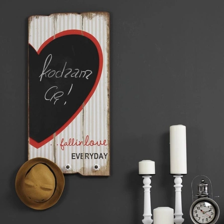 Poniżej piękny napis: „fall in love EVERYDAY”. Część napisu została wykonana czcionką typu script, która wygląda jak pismo odręczne. Dodatkowo w czerwonym kolorze. Pozostała część napisu została wykonana bardziej minimalistyczną czcionką w kolorze czarnym. Na samym dole drewnianej tablicy zostały zamontowane trzy wieszaczki wykończone ozdobnymi ceramicznymi gałkami.