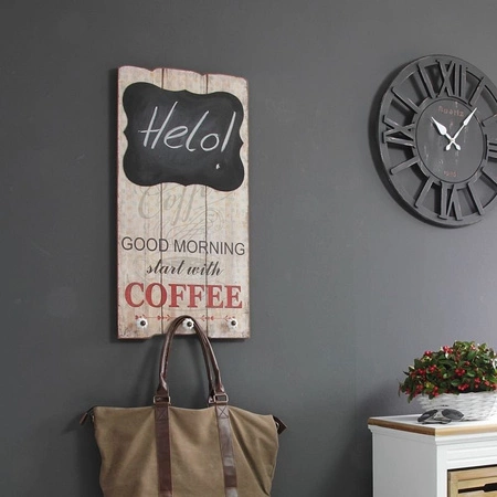 Trzy zbite deski tworzą przestrzeń pomalowaną na beżowy kolor z pastelowym deseniem. Wodną farbą namalowano parującą filiżankę kawy. W górnej części znajduje się czarne pole o interesującym kształcie do pisania kredą. W dolnej części umieszczono napis: „GOOD MORNING stat with COFFEE”. Użyto czarnych oraz czerwonej czcionki. Wyróżniono wyraz kawa i do niego dobrano kolor delikatnego szlaczka, pod którym znajdują się trzy wieszaki, wykończone ozdobnymi gałkami z ceramiki.