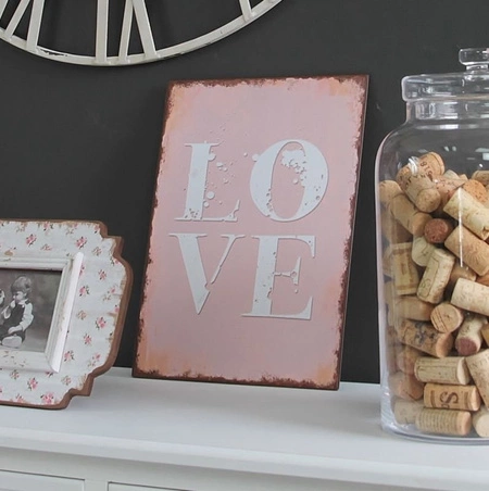 Piękna płyta metalowa pomalowana na jasny róż i nieco postarzona na brzegach. Napis „LOVE” został ustawiony w dwóch wierszach i zajmuje całą przestrzeń tablicy. Zwraca uwagę przepiękna, biała czcionka, która w górnej części napisu ma dodane białe plamki, natomiast w dolnej plamki są od napisu odjęte. Ta subtelna gra ze wzrokiem ma swój niepowtarzalny urok. Można się pokusić o symbolikę takiego ujęcia napisu.
