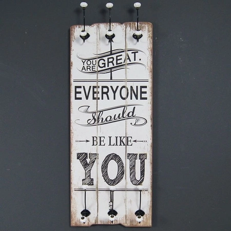 Elegancka tablica z sentencją i wieszakami na ubrania lub akcesoria.
