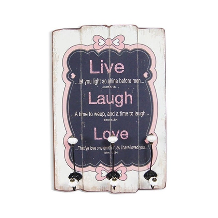 Tło ręcznie zbitej tablicy zostało pobielone i ozdobione w środkowej części uroczą ramką, otoczoną różowymi wstążkami z kokardkami i serduszkami. Kształt ramki jest nieregularny i składa się z malowniczych łuków. Wstążki otaczają czarne pole z trzema cytatami z Pisma Świętego. Sentencje odnoszą się do trzech wyróżnionych różową i dużą czcionką słów: „Live”, „Laugh” oraz „Love”. W dolnej części tablicy zostały zamontowane czarne wieszaki, wykończone ozdobnymi, białymi kulkami.