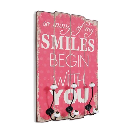 Ręcznie zbita z desek tablica została pomalowana na różowo i ozdobiona białym napisem: „so many of my SMILES BEGIN WITH YOU”. Każda linia tekstu to inna czcionka, ale wszystkie utrzymane są w białym kolorze. Wyglądają razem pięknie, ponieważ są gustownie dobrane i ładnie się komponują na tablicy. Zostały umieszczone na różowym tle, natomiast brzegi tablicy zostały artystycznie przetarte. W dolnej części tablicy umieszczono trzy podwójne wieszaki, wykończone ceramiczną kulką i pomalowane na czarno.