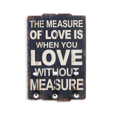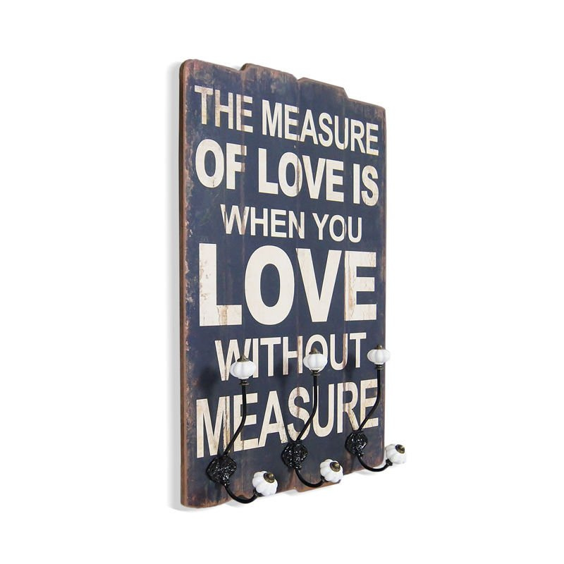 Drewniana tablica z sentencją o mierze miłości, z wieszakami.