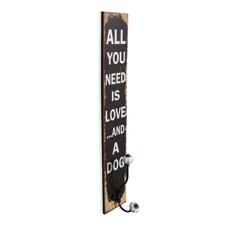 Pionowa drewniana tablica została pomalowana na czarno i przetarta na brzegach. Na ciemnym tle znajduje się biały napis: „ALL YOU NEED IS LOVE… AND A DOG”. Ta zabawna sentencja z pewnością przypadnie do gustu miłośnikom psów. Zastosowano prostą, białą czcionkę, o pięknym kroju. Przemyślana kompozycja typografii, kontrastowe kolory oraz żartobliwa treść tekstu, wpływają na przyjemny i radosny klimat.