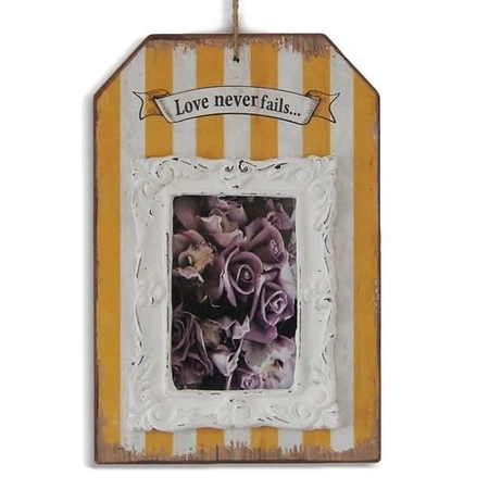 W stylu retro jest także napis na wstędze oraz biała oprawa wokół zdjęcia. Napis: „Love never fails…” na narysowanej szarfie znajduje się ponad zdjęciem. Elegancka czcionka i ustawienie tekstu pod kątem sprawia wrażenie własnoręcznie wykonanego. Poniżej znajduje się miejsce na prostokątne zdjęcie. Otaczająca je ramka z masy plastycznej z przecierką ma nieregularną krawędź zewnętrzną i została ozdobiona liśćmi i wolutami w pięknej kompozycji.