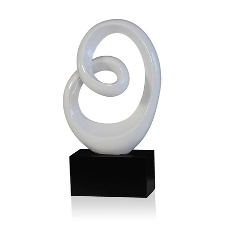 Abstrakcyjny kształt na czarnym matowym postumencie. Krągłe formy figurki, która tworzy malowniczą pętlę na środku kompozycji, stanowią zamknięty kształt. Wyraźnie widać krawędź, na której załamuje się światło padające na powierzchnię. Figurka jest polakierowana na wysoki połysk, co wpływa na pogłębienie efektu połysku na wypukłych częściach białego kształtu.