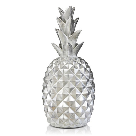 Figurka została odlana z polistyrenu i pomalowana na jednolity srebrny kolor półmatową farbą. Kształt ananasa to fantastyczna kombinacja pięknych krawędzi, zarówno skórki otaczającej owoc, jak i zielonej części. Srebrne powierzchnie pięknie się mienią i grają światłem na geometrycznych kształtach ananasa.