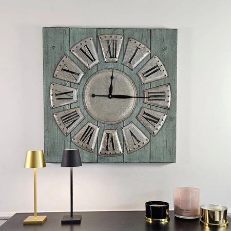 Kwadratowa płyta zbita z desek została pomalowana na sucho turkusową farba z delikatną przecierką. Zamocowano w niej pola z blachy ocynkowanej na godziny. Zarówno mocowanie nitami, jak i cyfry rzymskie odznaczają się ze względu na ciemny kolor i stanowią industrialną dekorację zegara. W centrum tarczy znajduje się okrągłe pole z blachy ocynkowanej, w którym zamocowano czarne wskazówki. Mechanizm na baterię 1,5V.