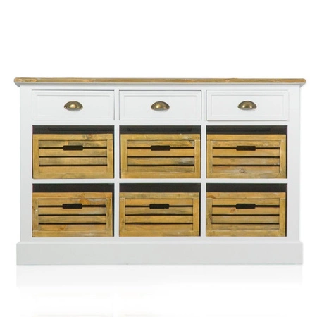 Piękna komoda w stylu prowansalskim, shabby chic lub rustykalnym.Odpowiedni dobór kolorów we wnętrzu jest bardzo ważny, pomieszczenia skąpane w jasnych kolorach wydają się większe i bardziej przestronne. Subtelne pastele, beże i szarość to kolory bliskie naturze. Białe drewniane meble połączone z kolorem drzewa to połączenie rustykalnej stylistyki z elegancją podmiejskiego salonu. Trzy szuflady w korpusie konsoli jak i sześć drewnianych skrzyneczek imitujących szuflady nadają jej praktyczności. Komoda pięknie zaprezentuje się w salonie, jadalni przedpokoju, pokoju dziecięcym. Powierzchnia jest celowo postarzana przez delikatne przetarcia na krawędziach, co daje zamierzony efekt niewielkich śladów użytkowania. :