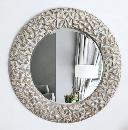 Okrągłe lustro zostało oprawione szeroką, bardzo efektowną ramą. Przypomina cięte bryłki lodu. Dzięki pobieleniu i przecierce, odsłaniającej powierzchnię w kolorze starego złota, dekoracja nabiera wspaniałego, trójwymiarowego efektu. Zwierciadło ma wręcz biżuteryjny charakter.
