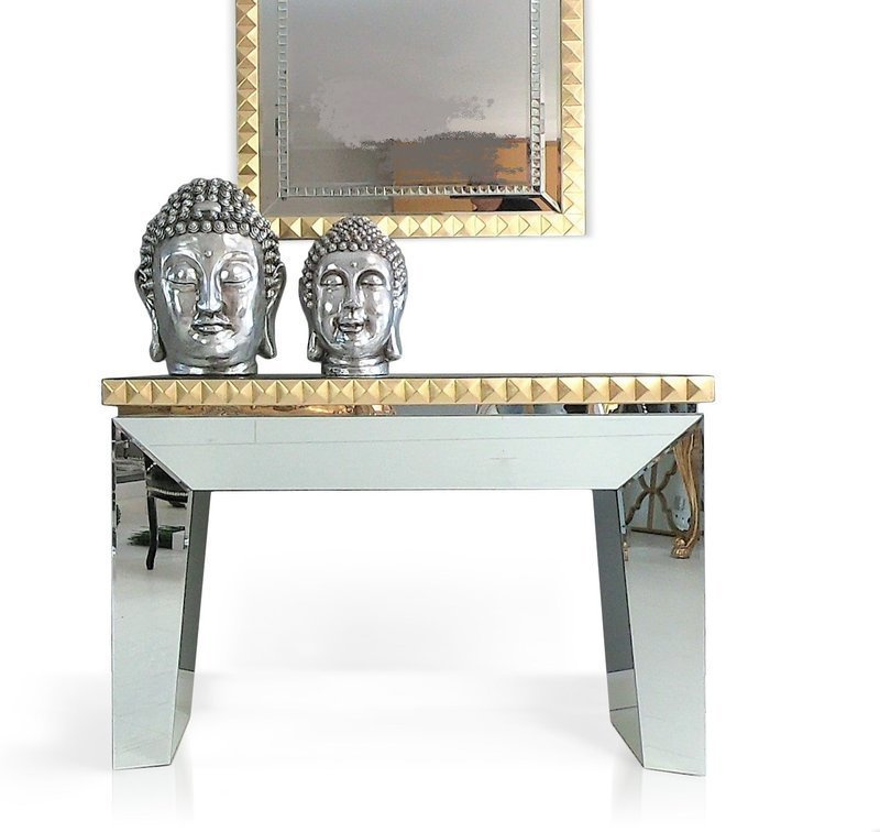 To połączenie zimnych powierzchni lustra z mieniącym się złotem ciepłym pasem dekoracyjnym, stwarza zachwycający efekt. Podstawa konsoli wygląda bardzo nowocześnie i jest niezwykle oryginalna. Połysk starego złota dodaje lekkości dość solidnej bryle konsoli i wpływa na wrażenie przepychu.