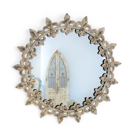 Z daleka lustro wygląda jak otoczone koronką z wysokimi czubkami. Tworzy to swoisty ornament. Z bliska okazuje się, że rama jest tworzona poprzez motyw stylizowanej lilii Burbonów. Fleur-de-lis to wzór kojarzony w sztuce z heraldyką monarchii francuskiej. Lilie zostały przymocowane do metalowego okręgu wokół tafli zwierciadła. Metalowa powierzchnia została malowniczo przetarta, co nadaje ramie efekt postarzenia.