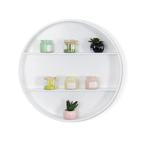 Zarówno okrągła rama, jak i półki mają tą samą szerokość. W tak interesująco utworzonej przestrzeni znajduje się miejsce na doniczki z kwiatami, figurki, butelki lub muszle czy inne ozdoby. To również dobry pomysł na wyeksponowanie kolekcji.
