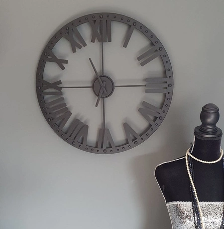 Zarówno wskazówki, jak i cyfry zostały wycięte z metalu i mają minimalistyczną, gustowną formę. Godziny łatwo odczytać, gdyż są duże i wyraźne, dlatego będą widoczne nawet z odległego kąta pomieszczenia. Lustrzany cyferblat został podzielony na trzy ćwiartki i nadaje zegarowi głębię, dodatkowo odbijając rzymskie cyfry.