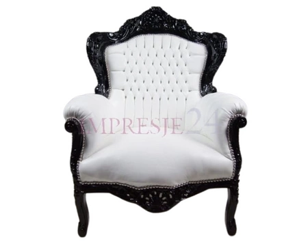 Kształt fotela jest inspirowany stylem Ludwika XV i sztuką baroku. Czarna, bogato zdobiona rama została zestawiona z białą skóra ekologiczną obicia. Rozłożyste siedzisko jest niezwykle miękkie i komfortowe. Zostało wykonane z tworzywa piankowego, wzmocnione sprężynami. Poręcze przechodzą w łagodne łuki ślimacznic. Pikowane oparcie zostało lekko odchylone, co wpływa na wygodę. Obicie zostało wykończone połyskliwymi napami.
